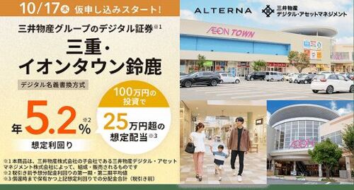 三井物産グループの運営する不動産に、証券税制で小口投資ができる「ALTERNA(オルタナ)」の紹介です。募集を開始したファンドは、イオンタウン鈴鹿を投資対象とし安定運用が期待されます。 <目次> 「〜三重・イオンタウン鈴鹿〜」ファンド スケジュール…