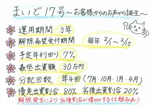不動産投資型かつ書面契約型の「なにわファンド」で、新たな案件が募集されます。今回は年利7%、途中解約付き、さらに特典付きというファンドになっています! <目次> まいど17号(解除希望受付期間あり) 申し込み方法と特典 現在の投資状況 まいど17号(…