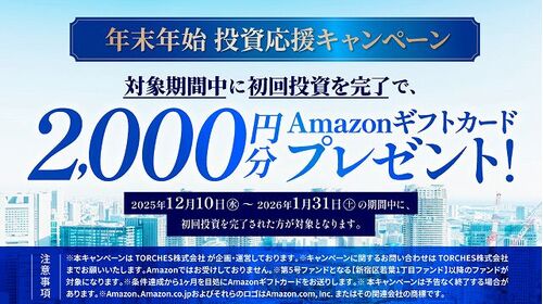 新しい不動産投資型クラウドファンディング、「TORCHES(トーチーズ)」の紹介です。最低1万円の投資で2,000円のアマギフがもらえる年末年始キャンペーンと、対象となる次回ファンドについて。 (運営会社・サービスの特徴) www.sallowsl.com <目次> 年末…